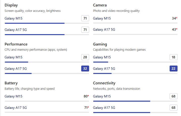 • 성능은 갤럭시 A17의 승리입니다. 엑시노스 1330 칩셋은 AnTuTu 종합 점수에서 12%, 특히 앱 실행 속도 등 일상적인 반응 속도에 큰 영향을 미치는 싱글코어 성능에서는 38%나 높은 점수를 기록하며 갤럭시 M15를 앞섭니다.