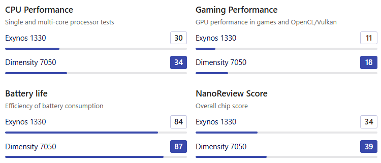 • 전력 효율성에서는 Dimensity 7050이 더 우세할 것으로 보입니다. 비록 엑시노스 1330이 더 미세한 5nm 공정으로 제조되었지만, 설계 전력(TDP)은 4W로 5W의 Exynos 1330보다 낮습니다.