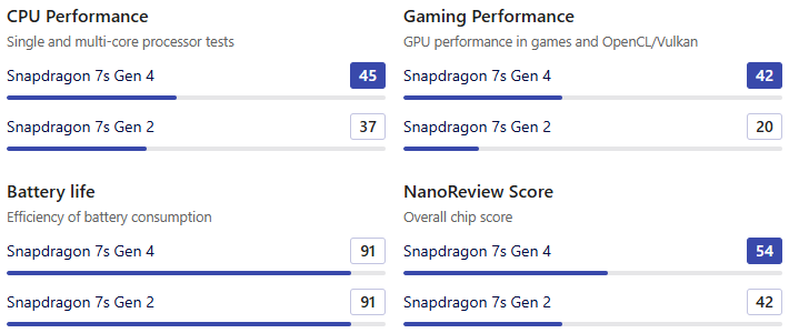 • 두 칩셋의 CPU 성능 차이는 코어 아키텍처의 세대 차이와 클럭에서 비롯됩니다. Snapdragon 7s Gen 4는 더 최신 세대인 Cortex-A720과 A520 코어를 사용하며, 성능 코어 클럭도 더 높습니다.