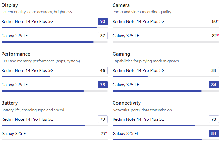 • 따라서 더 선명한 화면으로 미디어 콘텐츠를 즐기고 싶다면 Redmi Note 14 Pro+를, 조금이라도 더 큰 화면과 야외에서의 밝기가 중요하다면 Galaxy S25 FE가 더 나은 선택입니다.