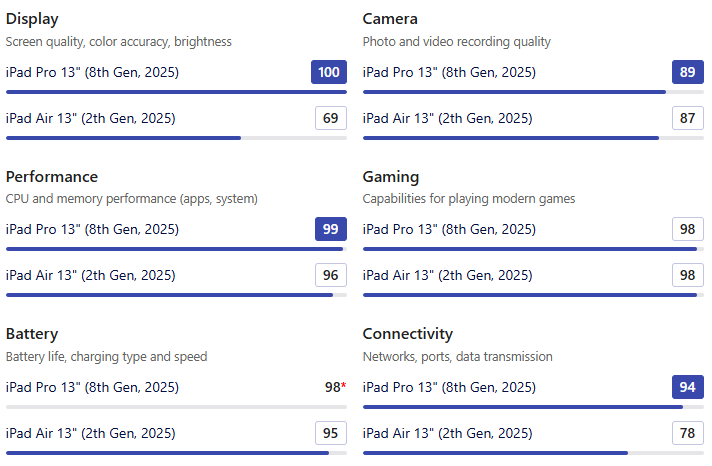 • 성능은 아이패드 프로 13의 압승입니다. 최신 M5 칩은 M3 칩 대비 모든 벤치마크 테스트에서 압도적인 성능 향상을 보여줍니다.