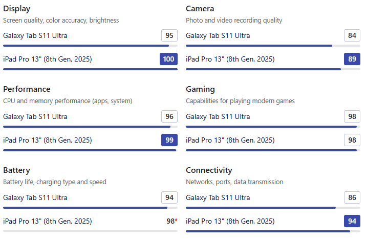 • 가장 큰 화면과 밝은 디스플레이를 원한다면 갤럭시 탭 S11 울트라가, 생산성 작업에 유리한 비율과 더 선명한 화질을 선호한다면 아이패드 프로 13이 더 나은 선택이 될 것입니다.