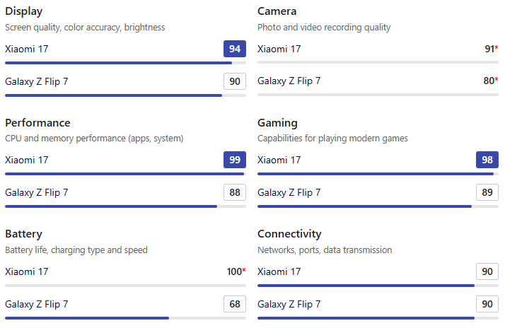 | 항목 | Xiaomi 17 | Galaxy Z Flip 7 |