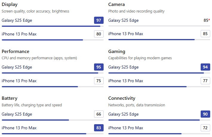 • 3년 9개월이라는 시간은 Galaxy S25 Edge에게 압도적인 성능, 메모리, 디스플레이, 디자인, 연결성 우위를 안겨주었습니다. 대부분의 영역에서 S25 엣지는 아이폰 13 프로 맥스를 크게 앞섭니다.