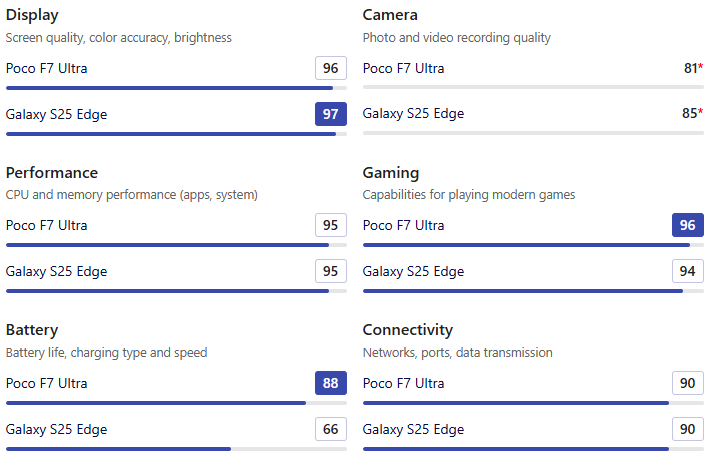 • 따라서 망원 줌 활용과 특수 동영상 기능이 중요하다면 Poco F7 Ultra를, 메인 카메라의 초고화소 디테일과 AF 지원 4K 셀피 영상을 선호한다면 Galaxy S25 Edge가 더 나은 선택입니다.