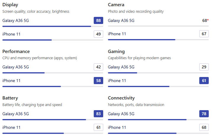 | SoC | Galaxy A36 5G | iPhone 11 |