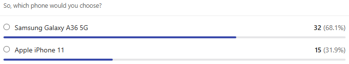 • 다양한 렌즈 구성과 OIS를 갖춘 고화소 메인 카메라를 원한다면 A36 5G가, 뛰어난 동영상 품질과 저조도 성능을 중시한다면 iPhone 11이 여전히 경쟁력이 있습니다.