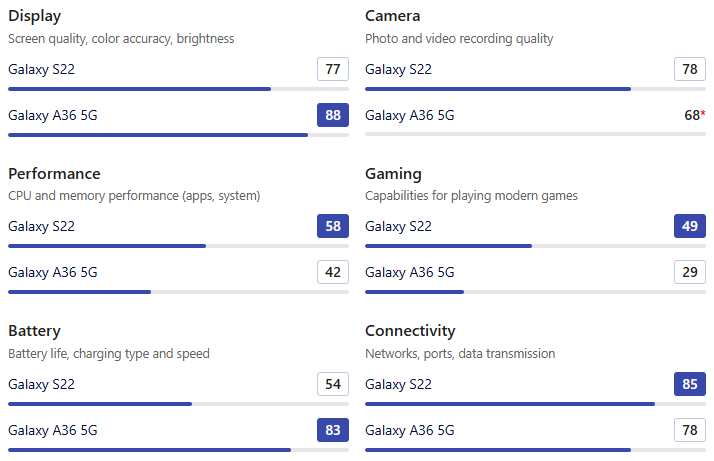 • 하지만 S22의 치명적인 단점은 바로 배터리입니다. A36 5G보다 47%나 짧은 사용 시간(16시간 55분)은 2025년 기준으로 사용하기에 매우 불편할 수 있습니다. 반면 A36 5G는 압도적인 배터리 수명과 더 크고 밝은 화면이라는 확실한 무기를 가지고 있습니다.