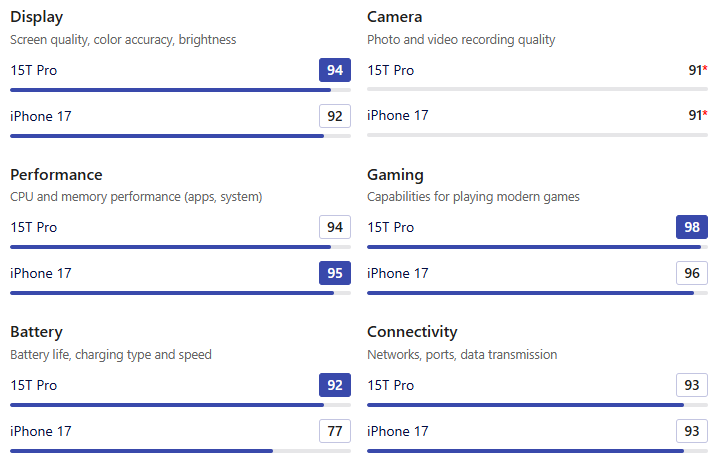 • Apple iPhone 17은 역방향 무선 충전을 지원한다는 유일한 장점이 있지만, 배터리 용량과 충전 속도 모두 15T Pro에 크게 뒤처집니다.