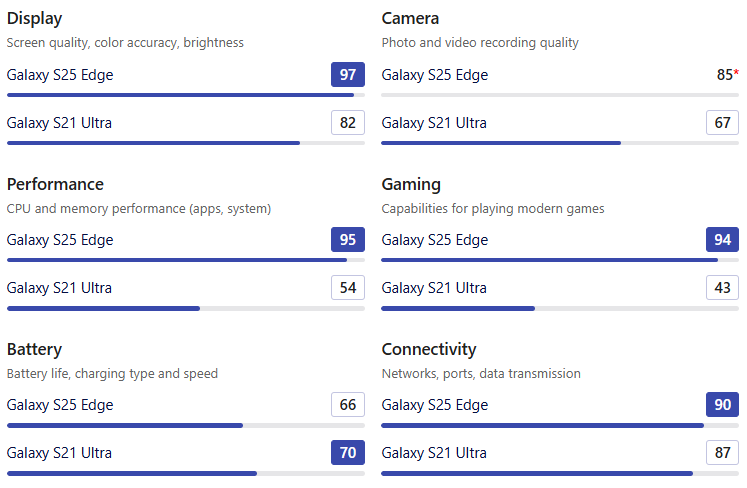 • 성능은 4년 5개월 늦게 출시된 Galaxy S25 Edge의 압승입니다. 최신 3nm 공정의 스냅드래곤 8 엘리트 칩셋은 5nm 공정의 엑시노스 2100 대비 모든 면에서 강력한 성능을 보여줍니다.