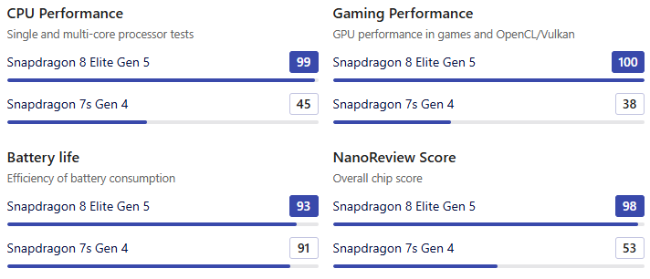 | CPU 코어 구성 | 스냅드래곤 8 Elite Gen 5 | 스냅드래곤 7s Gen 4 |