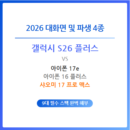 2026년 대화면 및 파생 모델 시장은 사용자 타겟이 매우 뚜렷하게 나뉩니다. 갤럭시 S26 플러스는 190g의 뛰어난 휴대성과 QHD+ 화질로 대화면 스마트폰 중 최고의 밸런스를 보여줍니다. 애플의 아이폰 17e는 가격 접근성을 극대화한 엔트리 모델이며, 아이폰 16 플러스는 6.7인치 대화면과 iOS 생태계를 안정적으로 제공합니다. 반면 샤오미 17 프로 맥스는 무려 7500mAh의 배터리와 최상급 성능 칩셋으로 무장하여 하드웨어 스펙 지향형 기기의 정점을 보여줍니다.