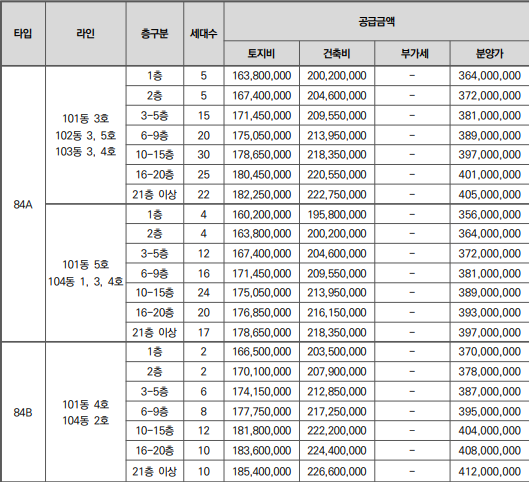 아래의 표의 분양가격은 기준층을 기준으로 표기한 것입니다. 층별 동별 가격이 상이 할 수 있습니다.