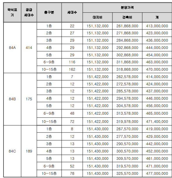 아래의 표의 분양가격은 기준층을 기준으로 표기한 것입니다. 층별 동별 가격이 상이 할 수 있습니다.